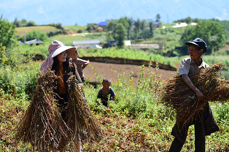 王福美走到田间地头向乡亲了解今年苦荞的种植情况(摄影 陈艺)