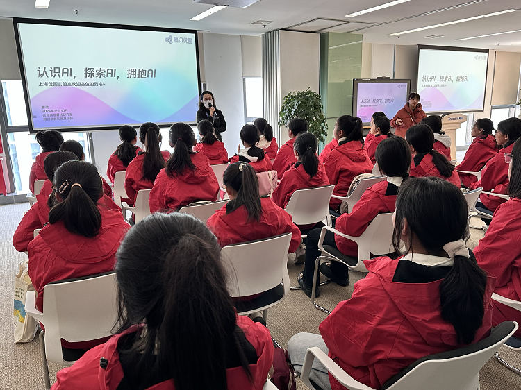 游览后,腾讯员工志愿者吴老师为女孩们带来了《互联网职业启蒙与生涯规划》课程讲座,吴老师表示:“从孩子们认真听讲和充满求知的目光中,我真切的感受到她们对于前沿科技及科技发展带来的职业成长机会的浓厚兴趣,希望这场分享可以帮助同学们在成长的道路上开拓视野,树立更加清晰地职业方向。”