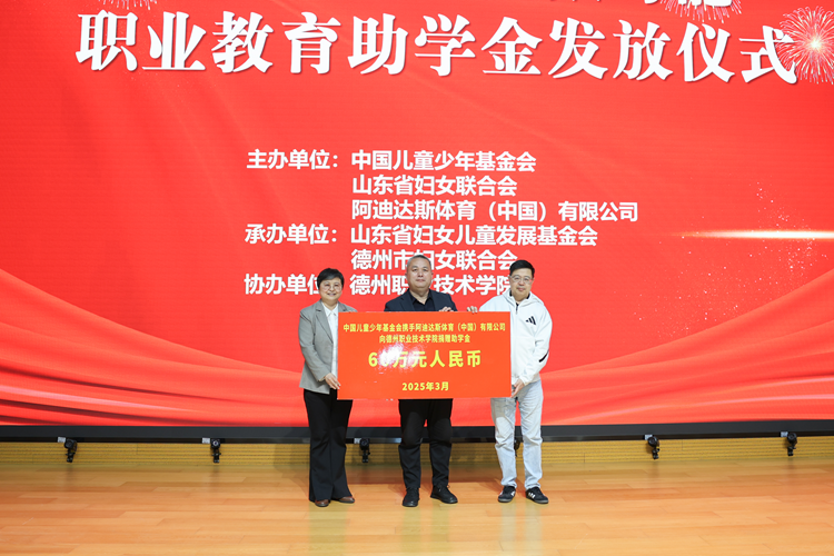 3月27日,由中国儿童少年基金会(以下简称中国儿基会)、阿迪达斯体育(中国)有限公司(以下简称阿迪达斯)、山东省妇女联合会主办,山东省妇女儿童发展基金会、德州市妇联承办的“圆梦未来·无限可能”公益项目职业教育助学金发放仪式在德州职业技术学院举办。中国儿基会副秘书长王海静,山东省妇联党组成员、副主席李丽,德州市委常委、统战部部长张志华,阿迪达斯大中华区政府关系副总裁王若海,以及受助学生、教师代表等130余人参加发放仪式。仪式由德州市妇联党组书记、主席刘芳主持。